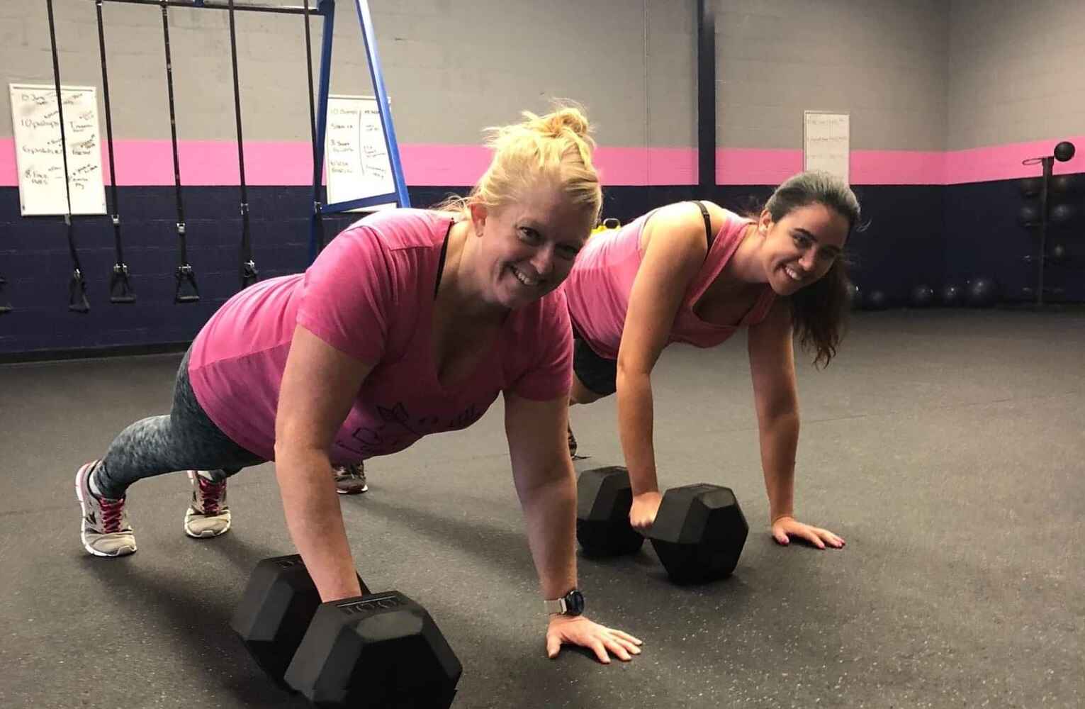 This image shows two women actively participating in a fitness bootcamp session at Glatter Fitness in Richmond. They are both engaged in a challenging plank exercise while holding dumbbells, demonstrating their strength and commitment to their weight loss and fat loss goals. The gym environment is well-equipped and supportive, providing effective personal training and group workouts aimed at improving overall health and fitness.